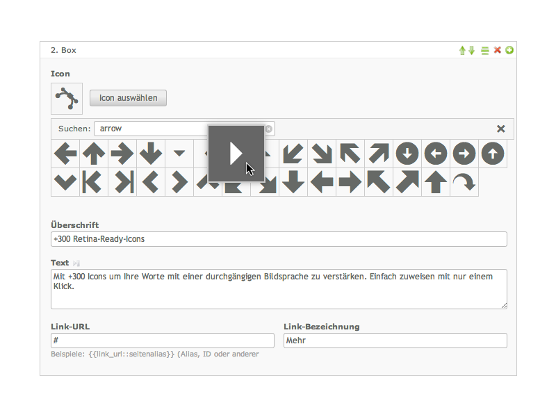 Weisen Sie Feature-Boxen, Link-Listen und vielen weiteren Elementen Icons mit nur einem Klicks zu. Die integrierte Suchfunktion hilft Ihnen schnell das passende Symbol für Ihre Inhalte zu finden. Weitere Informationen.