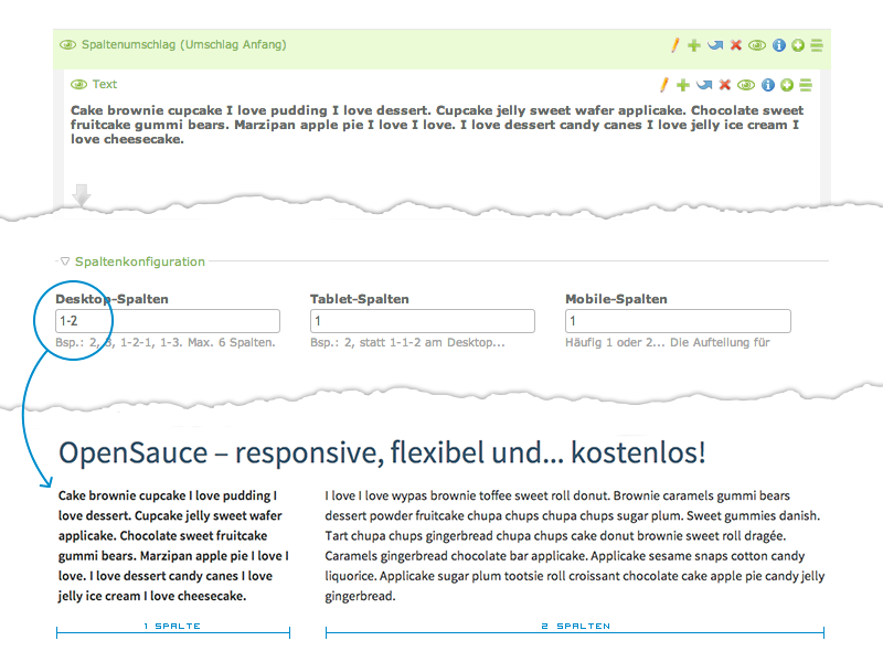 Teilen Sie Ihre Inhalte mit wenigen Klicks in mehrere Spalten auf. Dabei sind nicht nur gleich große Spalten möglich, sondern auch eine unregelmäßige Aufteilungen. Das Verhalten auf mobilen Geräten definieren Sie direkt mit.